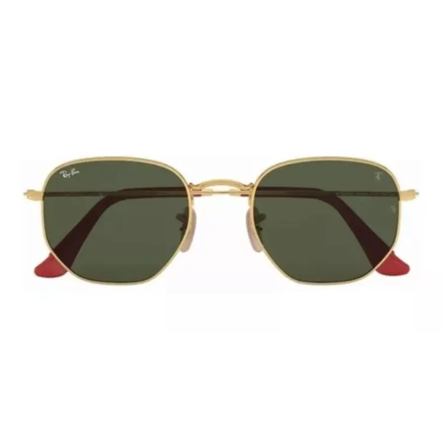 Combinan una forma geométrica moderna, con un armazón dorado metálico liviano y detalles en rojo, inspiradas en la escudería Ferarri. Las lentes verdes gris translúcido osccuro, ofreciendo protección UV 100%, completan un look sobrio, elegante y con espíritu de alta velocidad. Diseño deportivo, con alma premium.
